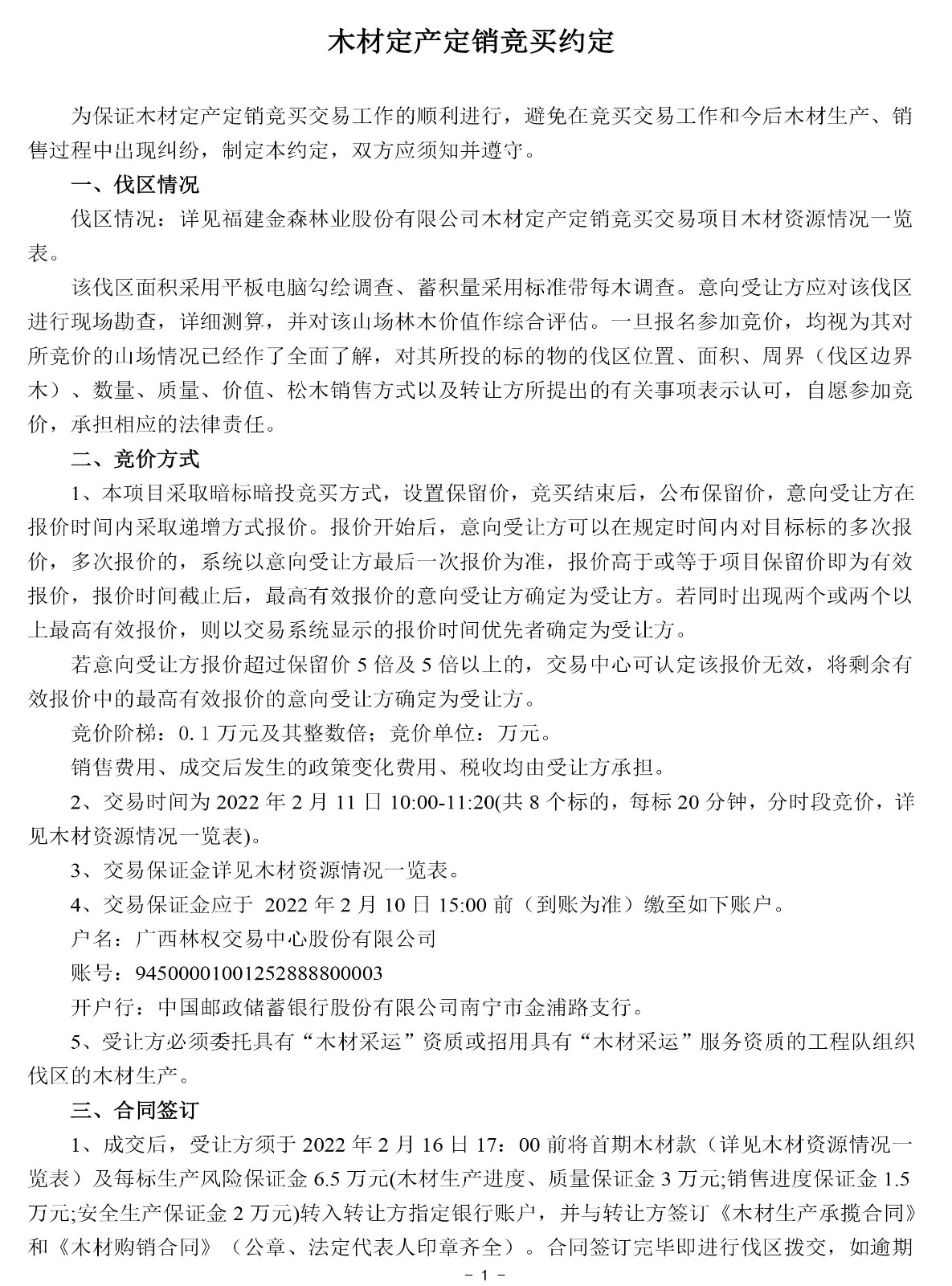保證金及 處理方式 | 1.須交納的交易保證金詳見木材資源情況一覽表。 2.交易保證金應于2022年2月10日15:00前(到賬為準)繳至如下賬戶: 戶名:廣西林權交易中心股份有限公司 賬號:94500001001252888800003 開戶行:中國郵政儲蓄銀行股份有限公司南寧市金浦路支行 注: ①交易保證金只接受銀行柜臺、網銀、電匯轉賬,不接受ATM轉賬、現金繳款; ②交易保證金轉賬單上須注明參與競拍哪一標的保證金 (如:0211金森1標保證金)。 3. 交易成交,在收到交易雙方出具的《款項收訖及正式書面合同簽訂確認函》后的5個工作日內,受讓方已交納的交易保證金由交易中心直接轉到福建金森林業股份有限公司指定銀行賬戶充抵履約保證金。 4.交易成交,受讓方如未按本公告約定與轉讓方簽訂成交文件的,或違反交易中心交易規則的,其已交納的交易保證金將不予返還; 5.未成交者的交易保證金交易中心將在交易結束后次日起3個工作日內全額無息返還。 | ||